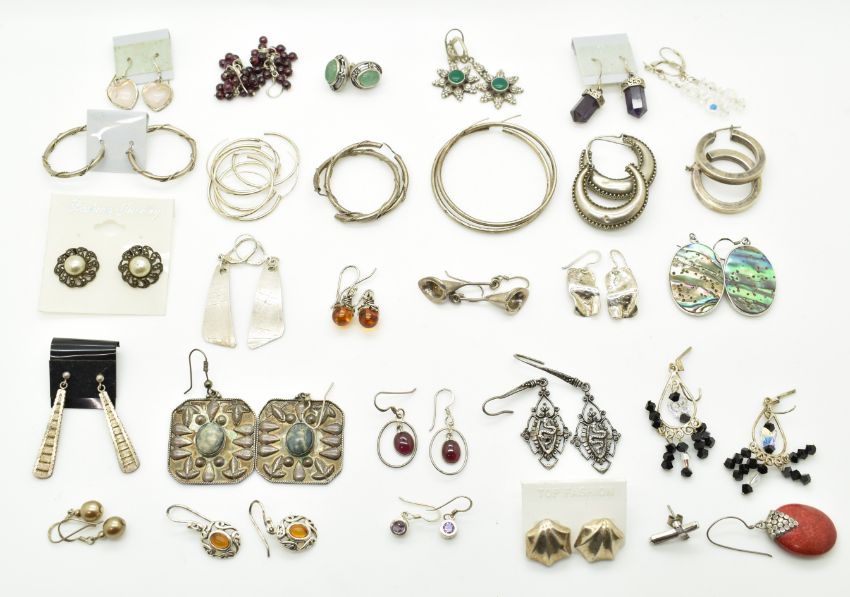 Twenty six pairs of silver earrings including amethyst, abalone, garnet, etc