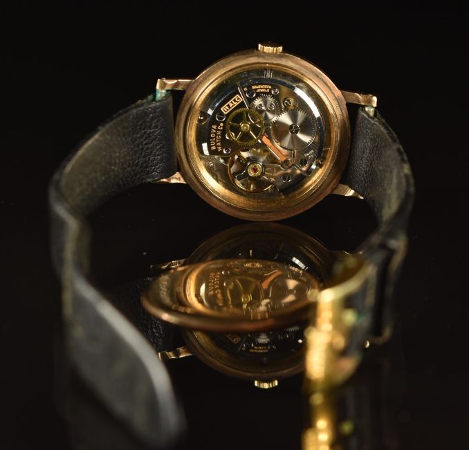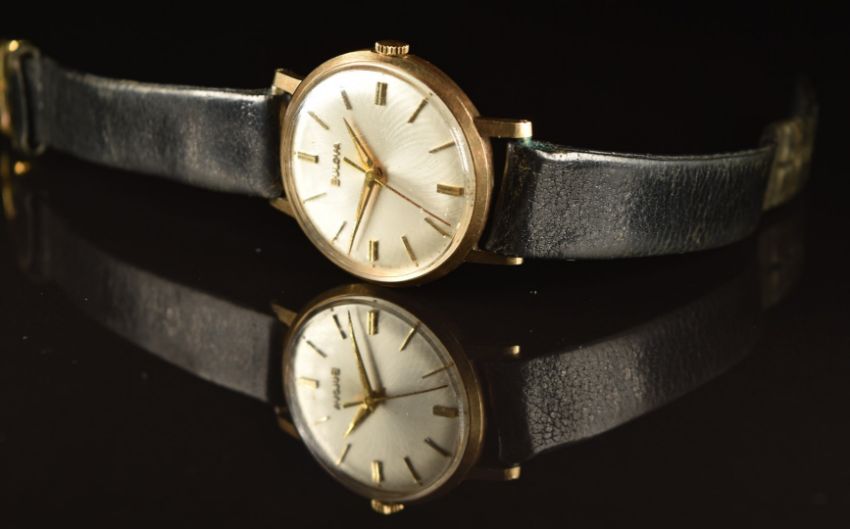 Bulova 9ct gold gentleman's wristwatch ref. 12372 with luminous gold hands, gold baton hour markers, silver dial and signed 17 jewel calibre 11 ALC movement, on black leather strap, case diameter 33mm, serial number 441489.