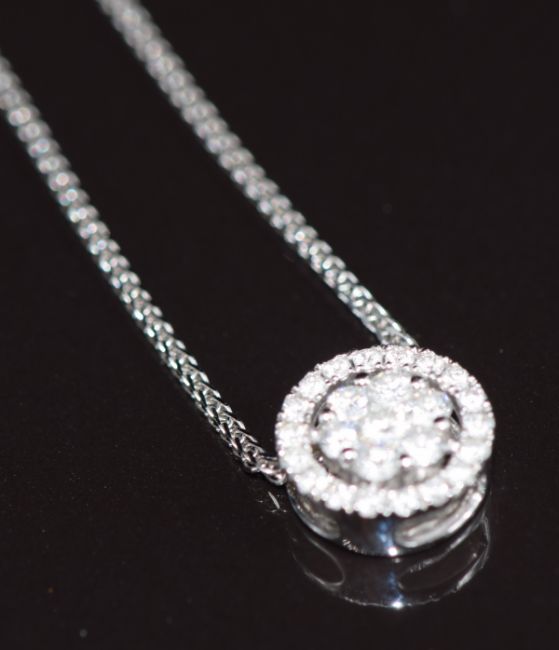 An 18k white gold necklace set with round cut diamonds, 2.7g
