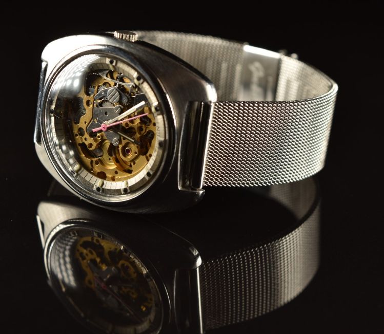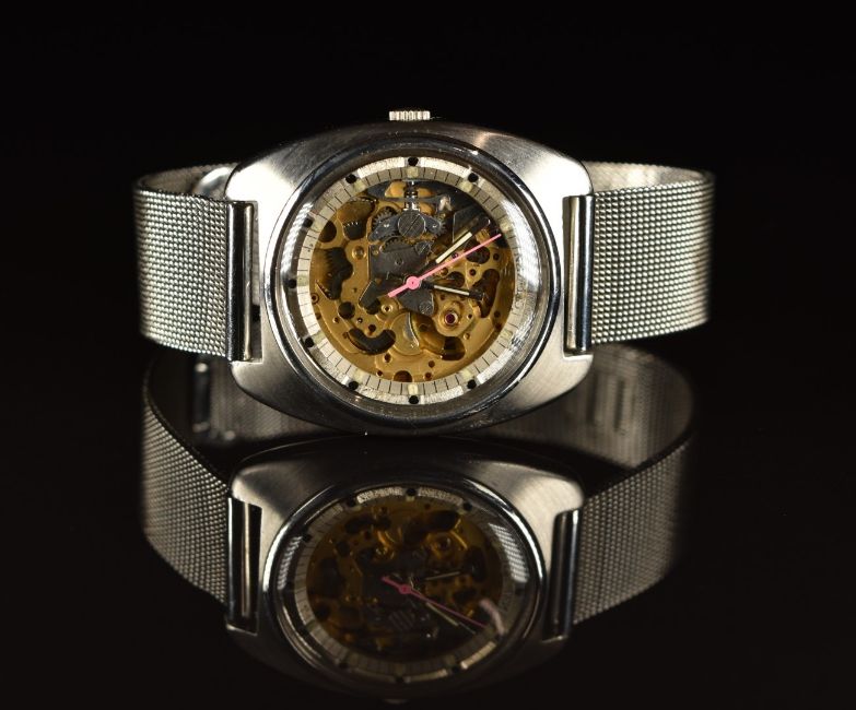 Citizen gentleman's skeleton wristwatch with luminous hour and minutes hands, red centre seconds hand, silver inner bezel, stainless steel case and signed 21 jewel calibre 8060A movement, on stainless steel bracelet, case diameter 36mm.