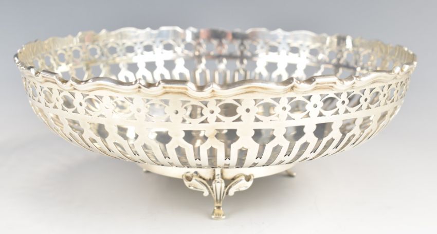 George V hallmarked silver bowl with pierced decoration, raised on three feet, Birmingham 1925, maker Henry Matthews, diameter 18cm, weight 239g