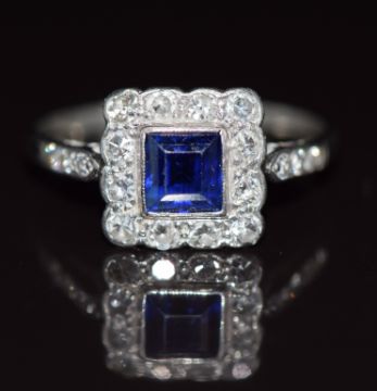 Art Deco 18ct white gold ring set with a square cut sapphire surrounded by diamonds, 2.3g, size N