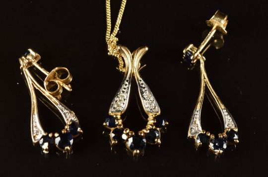 A 9ct gold pendant set with sapphires and diamonds, with matching earrings, 3.5g