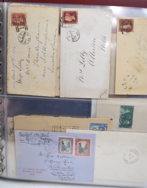 A folder of GB and world postal history from Queen Victoria 1d red to Queen Elizabeth II, ranges include Commonwealth including Australian Antarctic Territory 1966 set on covers, Middle East, India, USA etc