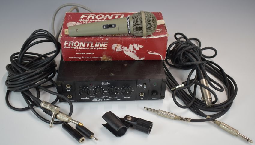 Melos DE-1 Echo BBD 1980s analogue delay effects unit, and a Frontline dual impedance microphone, in original box.