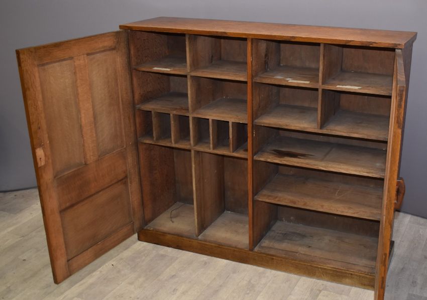 Arthur W Simpson Arts & Crafts oak cupboard with panelled doors opening to reveal variously sized pigeon or cubby holes, originally made for the vendor's relative William Somervell, Liberal MP for Kendal, W130 x D37 x H112cm