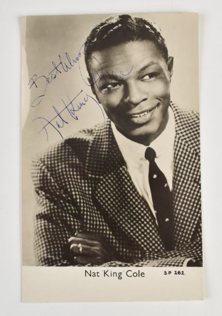 Nat King Cole autographed 19 x 12cm postcard signed and inscribed 'Best always Nat King Cole' to the top left in blue ink.