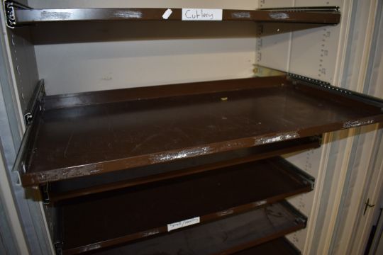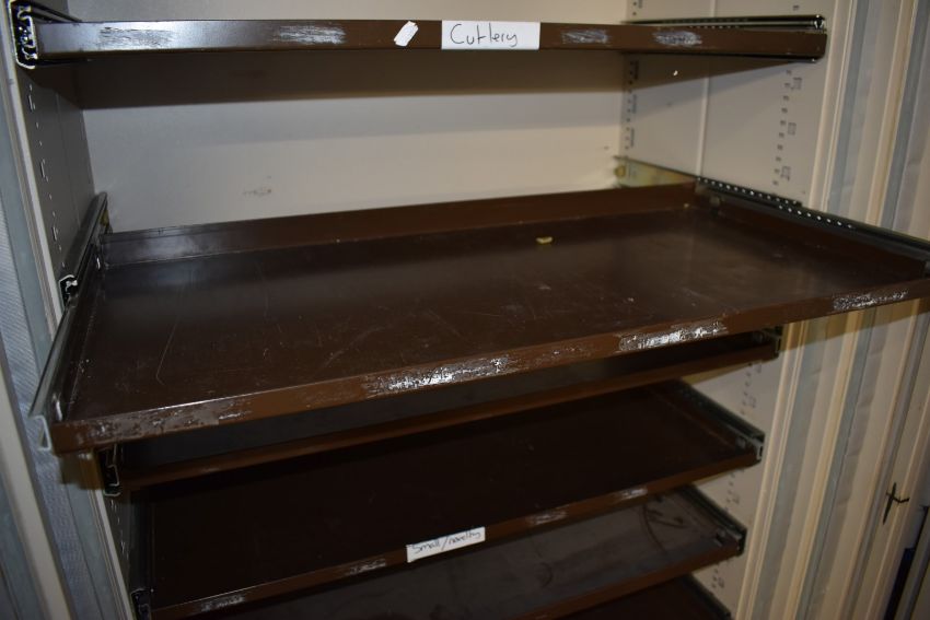Large safe, with key, opening to reveal pull out shelves, W122 x D90 x H185cm. Please note when considering collection this is towards 1 ton in weight