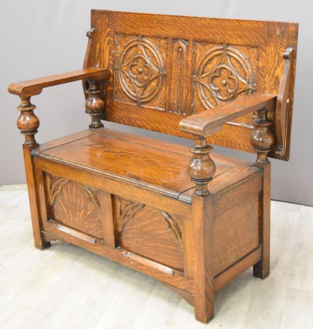 Oak monk's bench with carved decoration, length 106cm