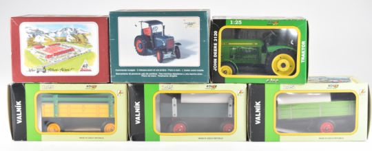 A collection of modern European tin plate farm vehicles all in original boxes.