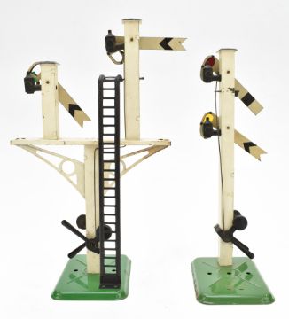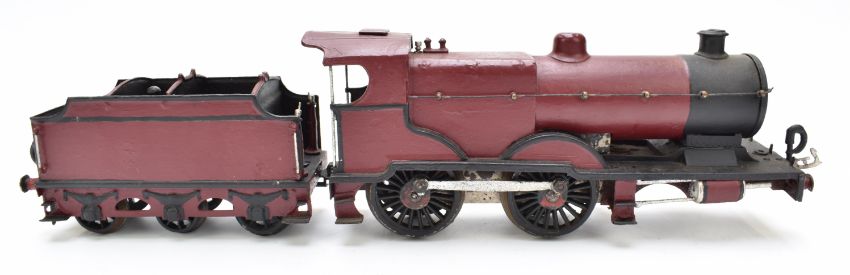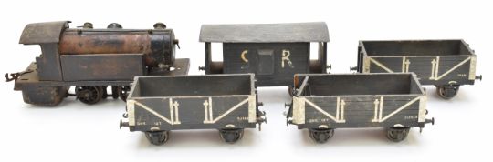 Hornby and other 0 gauge model railway locomotives and accessories comprising clockwork Midland Compound tender locomotive, 0-4-0 live steam tank locomotive, four wooden wagons and two signals