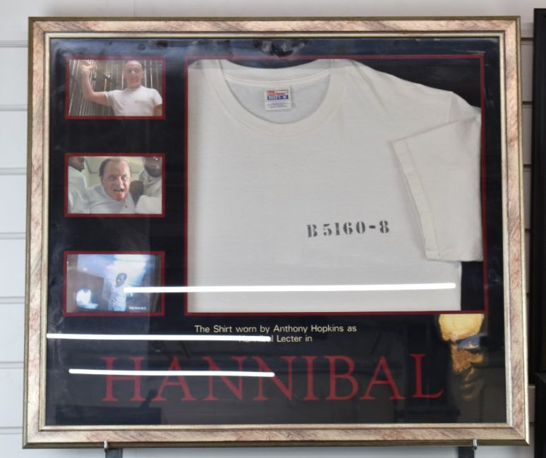 Hannibal (2001) framed T-shirt, worn by Anthony Hopkins during production, with certificate provided by Propstore.co.uk, 65 x 76cm together with a signed Red Dragon poster and related prints.