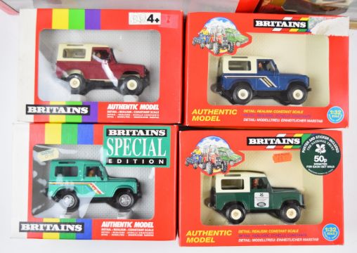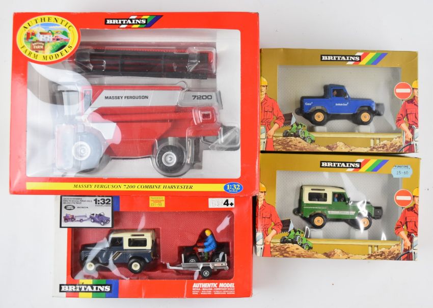 Fourteen vintage and modern Britains diecast model vehicles comprising thirteen Land Rovers and a Massey Ferguson Combine Harvester, all in original boxes.