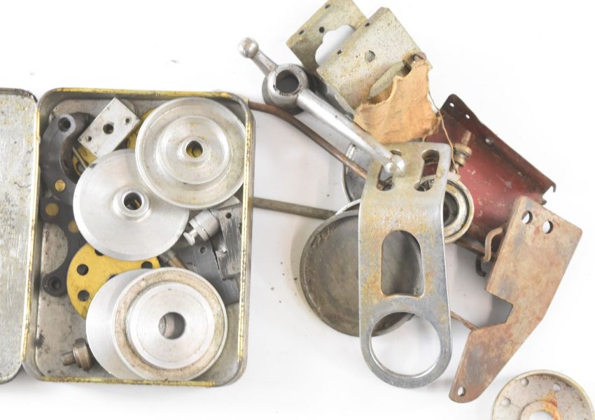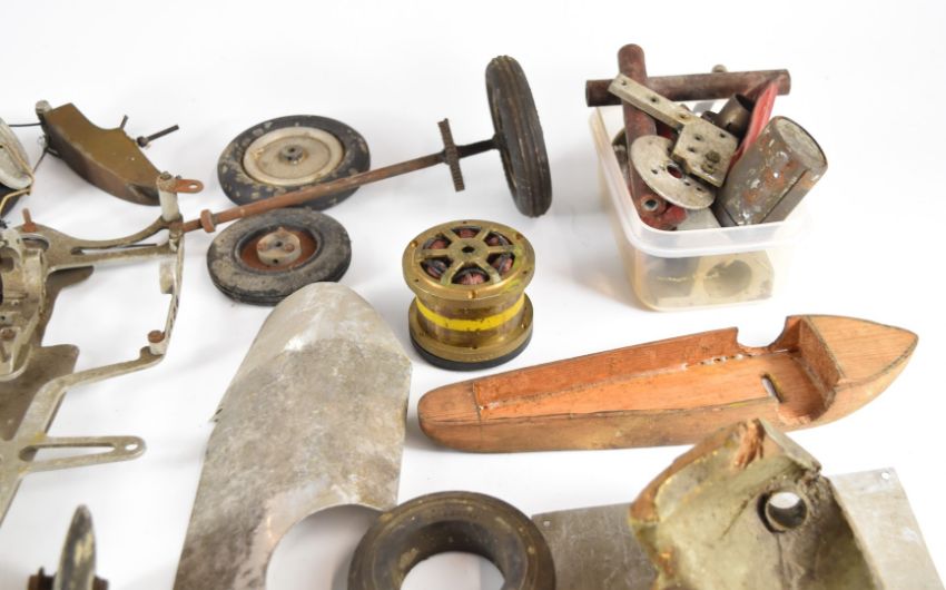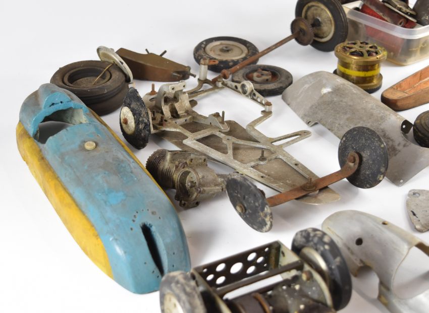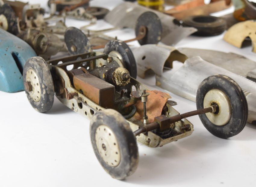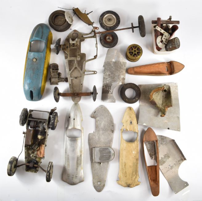 Part built vintage pylon racing model cars to include chassis fitted with Frog glow engine, aluminium and carved wooden body shells, gears etc, length of longest body shell 31.5cm