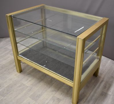 Aluminium framed shop display counter or display cabinet with two internal glass shelves, 107.5 x 67 x 90.5cm