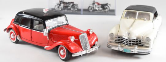 Nine diecast model vehicles including Lotus Racing cars, Citroen 15CV and 1947 Cadillac series 62.