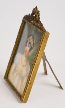 19th or early 20thC portrait miniature on ivory of a lady wearing a crown, tiara and necklace, 12 x 8.5cm, in period gilt frame with easel back, with ivory licence