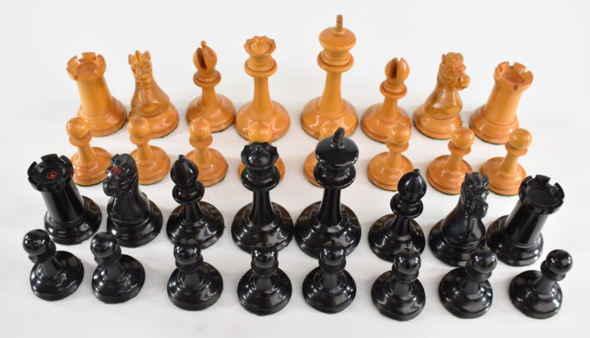 The Staunton Chess-Men boxwood and ebony chess set, height of King 7cm, in wooden box.