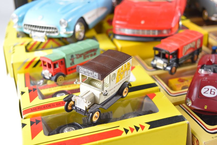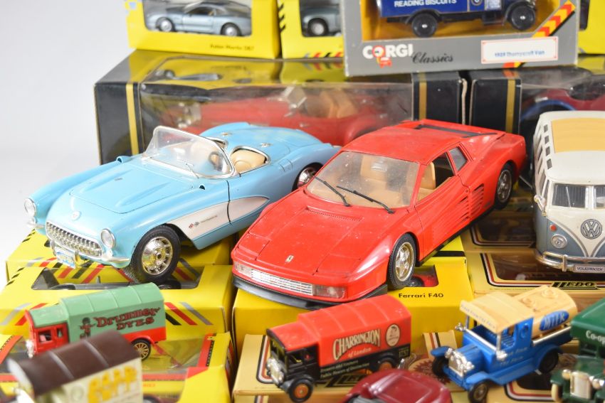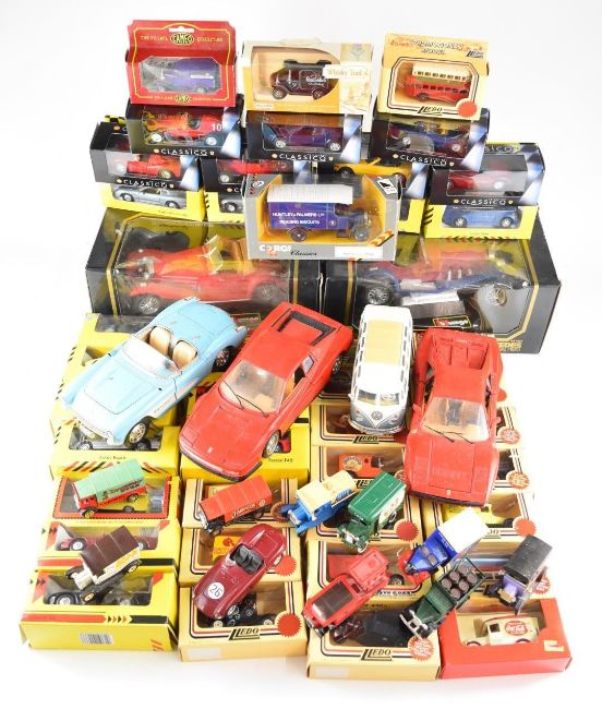 A collection of loose and boxed diecast model cars to include Burago, Lledo, Corgi, Shell Classico etc
