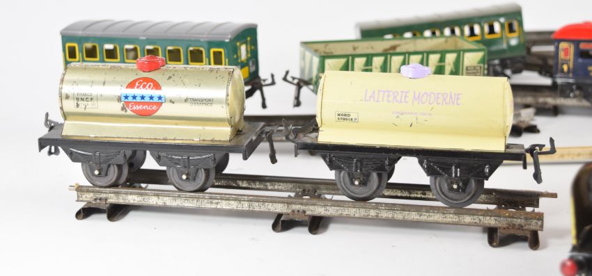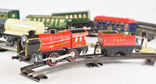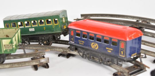 Hornby 0 gauge model railway set comprising clockwork tender locomotive and six various wagons.