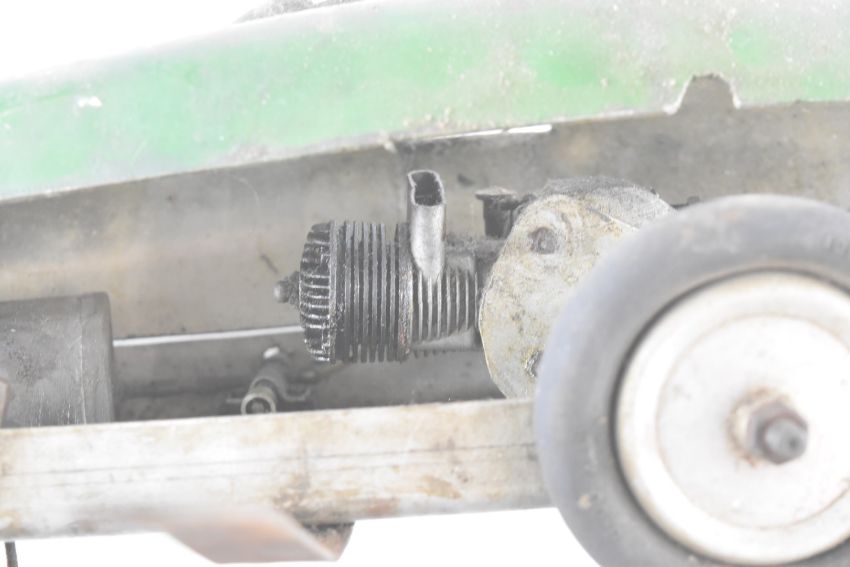 Vintage glow engine powered model pylon racing car in the style of a 1930s single seat racing car, fitted with a glow petrol engine, driving the rear wheels via gears and having aluminuim body, overall length 47cm