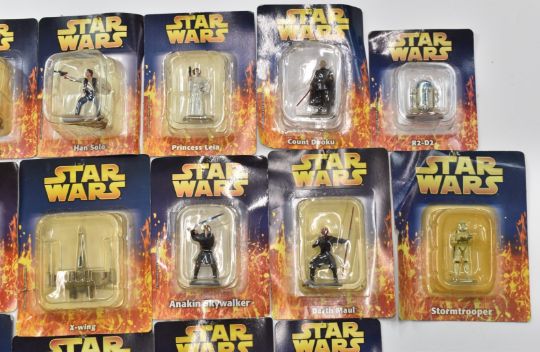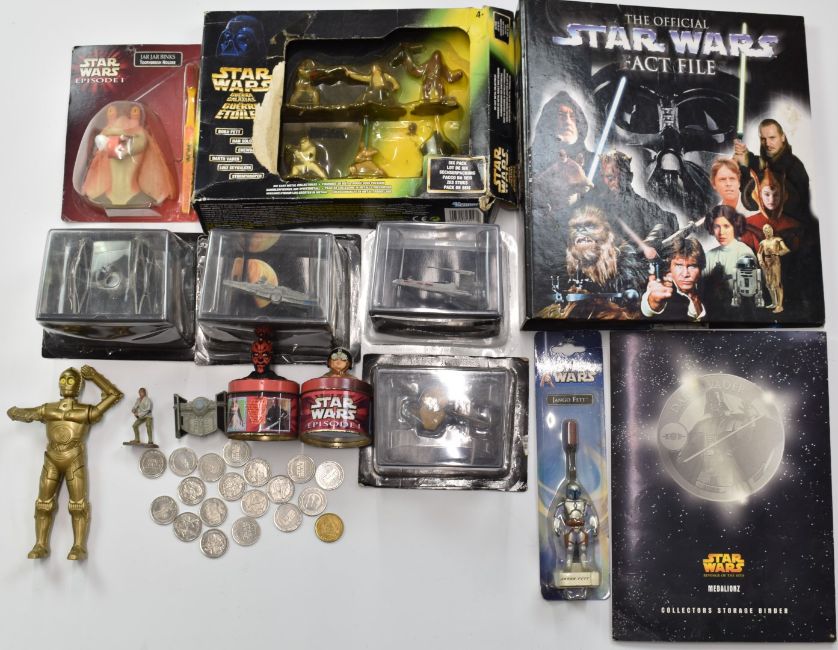 Twenty three Star Wars miniatures by DeAgostini together with a Kenner box set, collectible coins and trading cards.