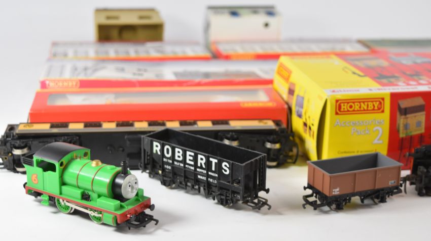 Hornby and other 00 gauge items to include Tri-ang Princess Elizabeth steam locomotive, 3 boxed wagons, Pullman coach, Percy steam engine and track packs