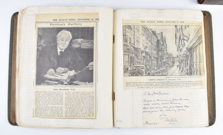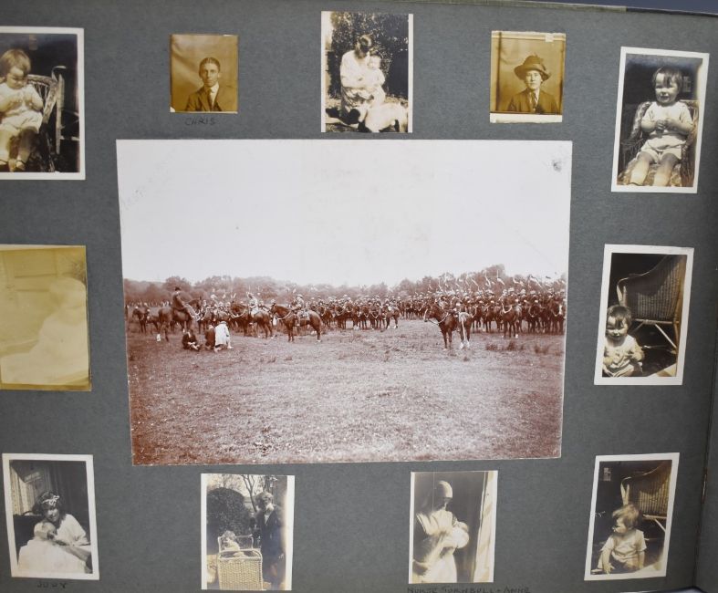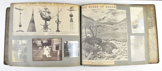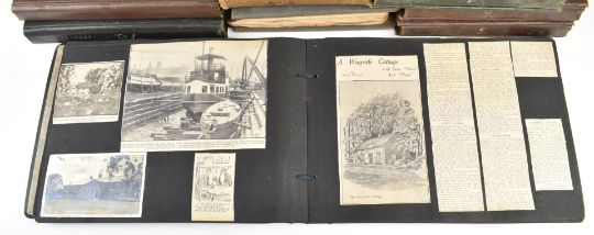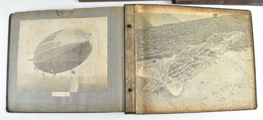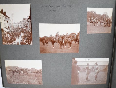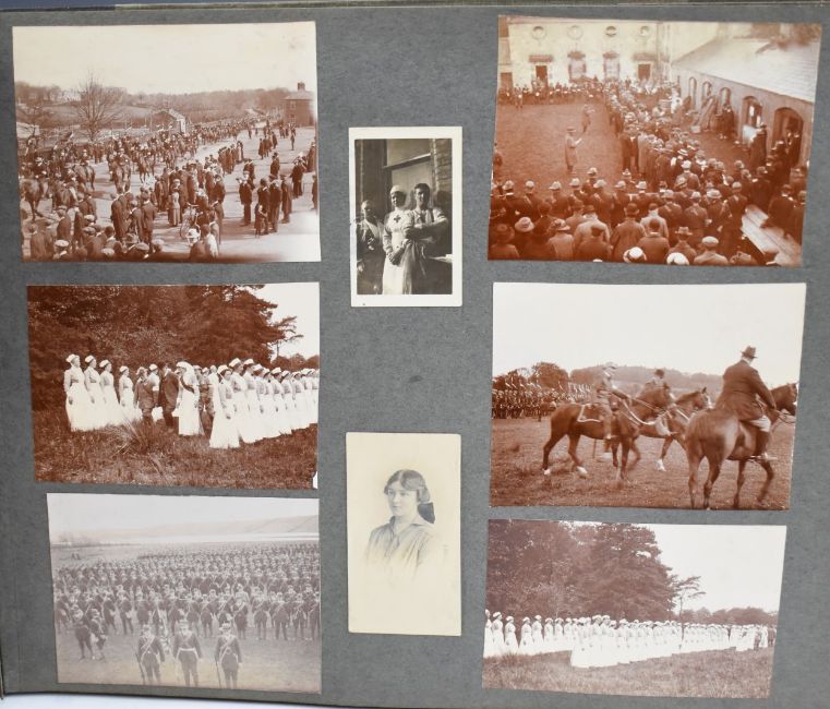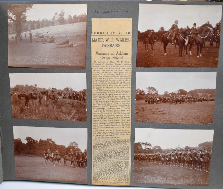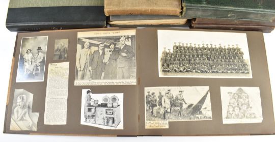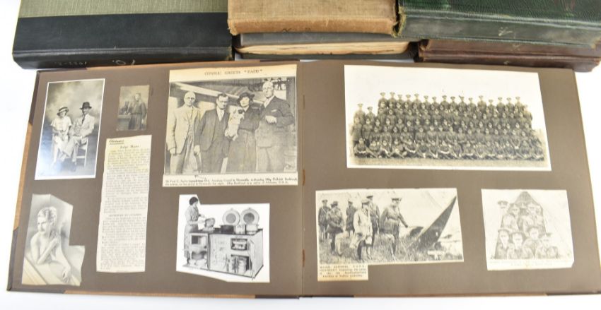 Nine photograph albums / scrapbooks, possibly relating to the family of Major W F Wailes - Fairbairn including sections devoted to Field Marshall Lord Plumer, photographs entitled 'Ulster Army 1914', Nurses on Parade, Imperial Airlines passenger plane, postcards of Gourock, Cork, WW1 artillery, Ruabon, Askham Grange, Glenlomond Hospital, cavalry school, France, WW1 postcards, Mainz 1915, Kensitas silks, typed first hand accounts of battles, summary of war effort, lots of references relating to Major Stenhouse