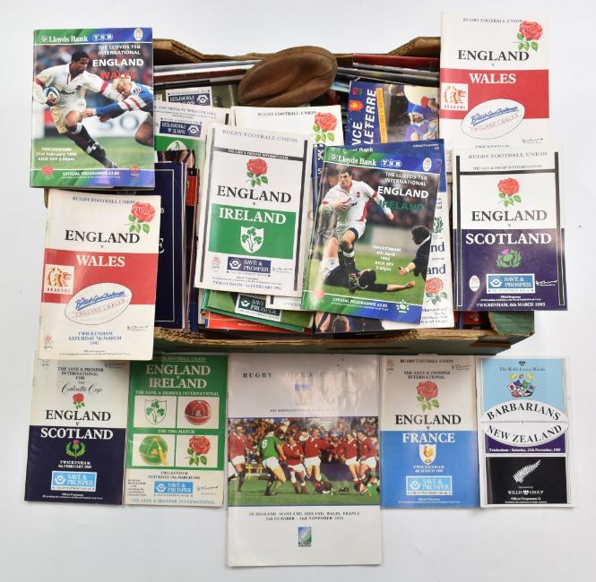 Large quantity of mainly international rugby union programmes and ephemera c1950s-2000s including Six Nations, England, Wales, Scotland, Ireland, New Zealand, South Africa, Italy, Barbarians, World Cup Final, invitations, tickets and itinerary for countries featuring in the World Cup 1991.