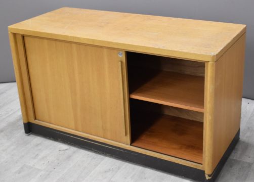 Two Gordon Russell of Broadway light oak tambour fronted cupboards, W120 x  D50 x H70cm