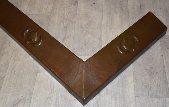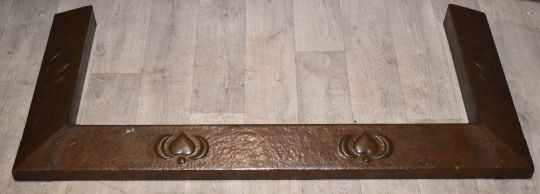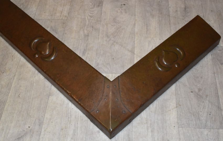 Arts & Crafts copper fire fender with embossed decoration, width 105cm