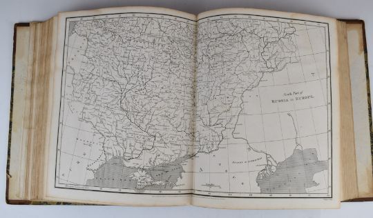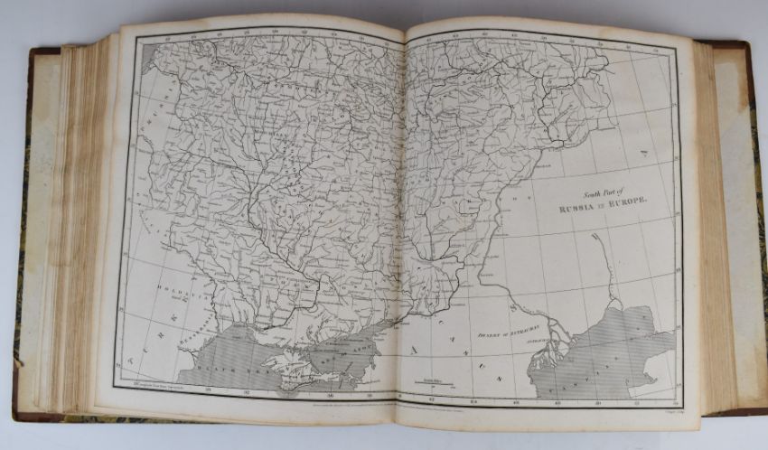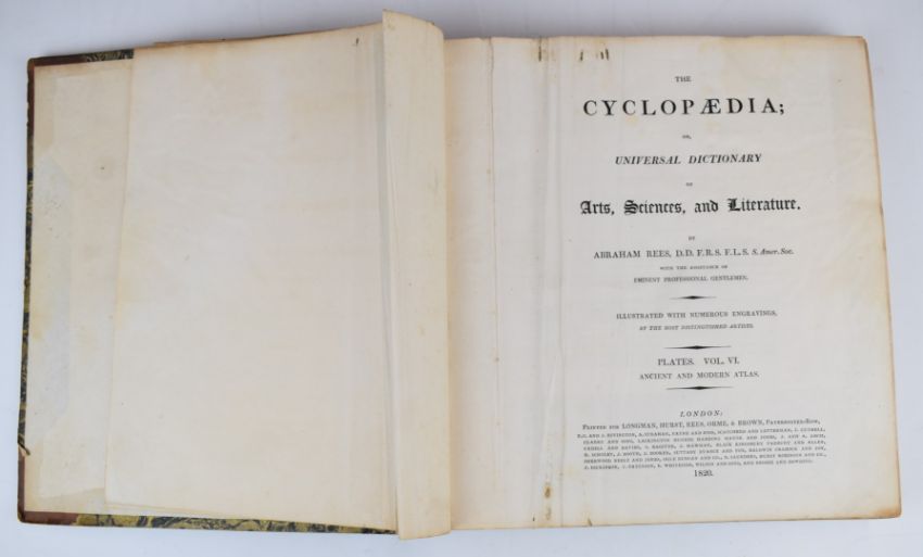 [Maps] The Cyclopaedia or Universal Dictionary of Arts, Sciences and Literature by Abraham Rees, illustrated with numerous engravings by the most distinguished artists, printed for Longman, Hurst Rees Orme & Brown 1820 – volume 6 only – Ancient & Modern Atlas with 63 engraved maps, bound in half leather, some wear and with damp marking top corner some pages