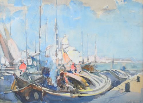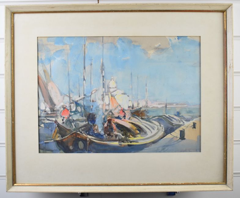 Arthur Henry Knighton-Hammond (1875-1970) watercolour Venice boats alongside a quay, signed lower right, 31.5 x 44cm, in white painted and gilt frame
