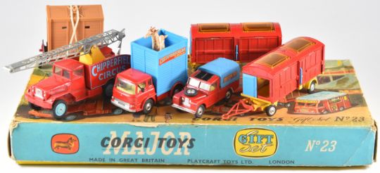 Corgi Toys diecast model Chipperfields Circus Gift Set 23 with Booking Van, Circus Crane Truck, two Animal Cage Wagons, Land Rover and Elephant Transport Trailer and various animals, in original box.