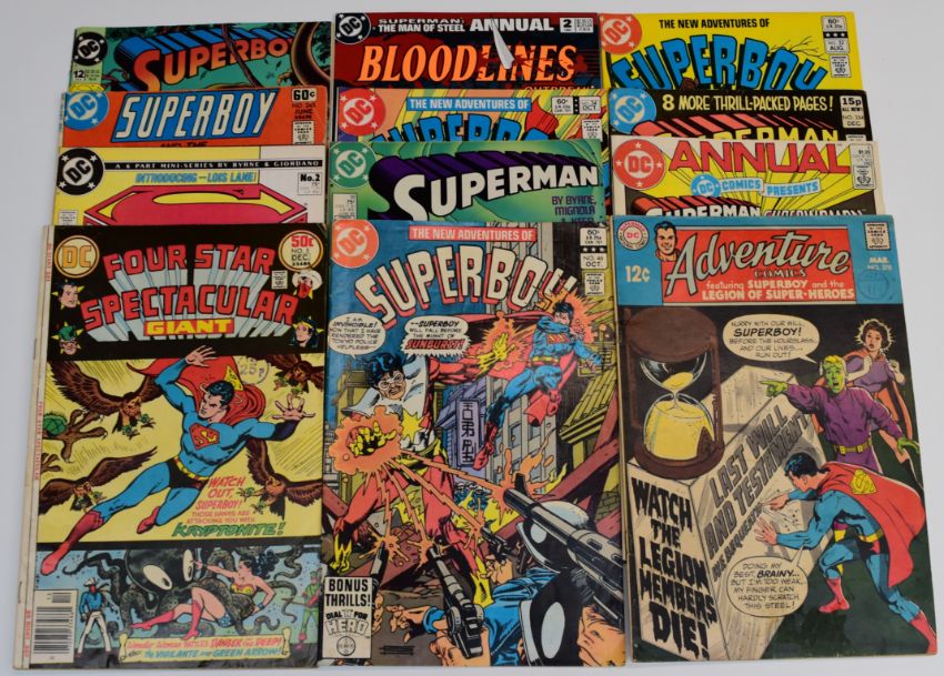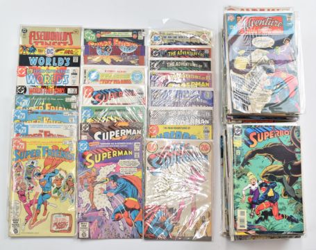 Over one hundred and twenty Superman and similar titles including Action Comics, Worlds Finest, Superman Man of Steel, Superboy, Adventure Comics and The Superman Family, all by DC Comics Inc.
