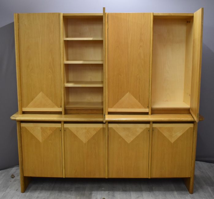 Windmill Furniture London Art Deco style parquetry light oak sideboard with four cupboard doors to both top and bottom, W200 x D56 x H190cm