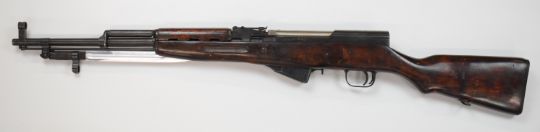 Deactivated Russian SKS 7.62x54mm semi-automatic assault rifle with integral folding bayonet, top plate stamped '1952r' below star, adjustable sights, sling mounts and 20 inch barrel, overall length excluding bayonet 102cm, serial number MN562, with deactivation certificate dated 13/02/23.