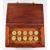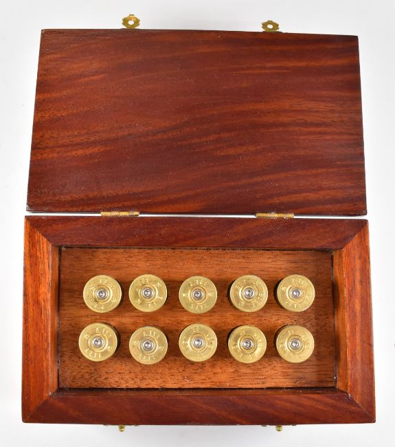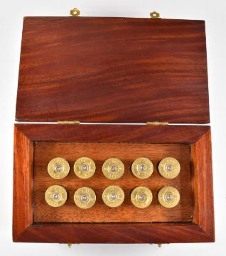 A set of 10 wooden and brass shooting butt markers in the form of shotgun cartridges numbered 1-10, in fitted wooden box.