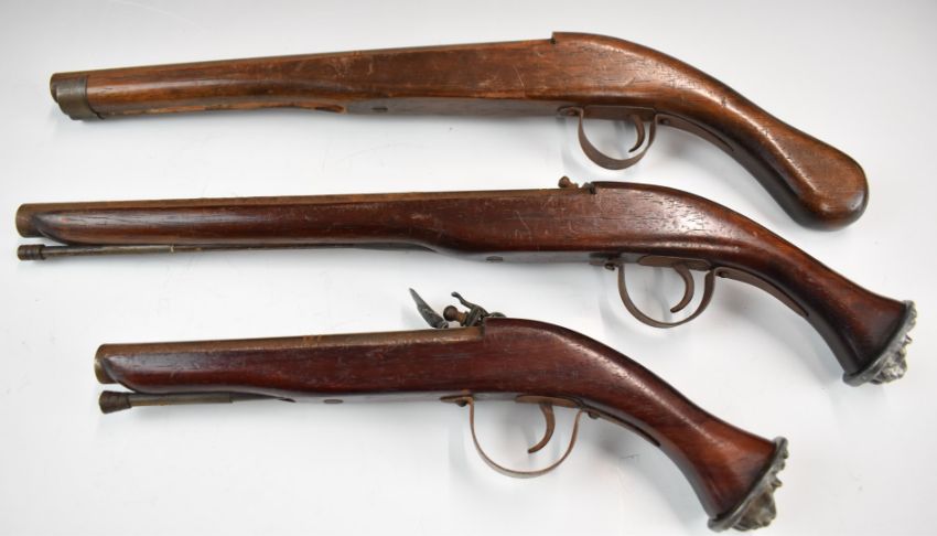 Three decorative flintlock pistols, two with lion mask butt caps, largest 48.5cm long.