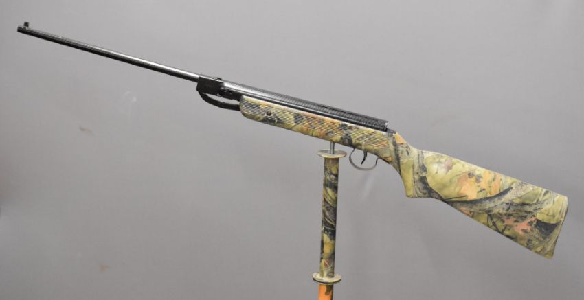 Unnamed .22 air rifle with camouflage finish, serial number 52273, on similarly finished stand formed on an alloy wheel.