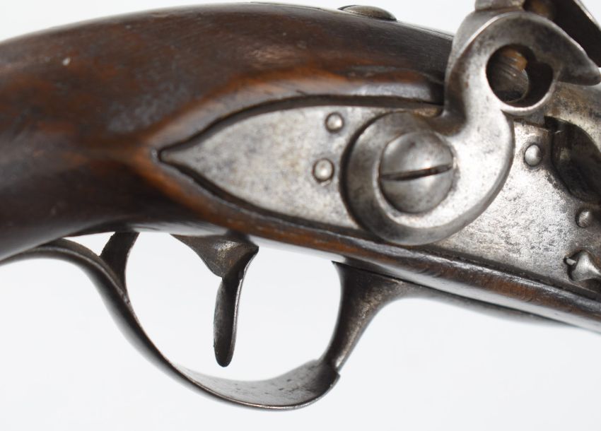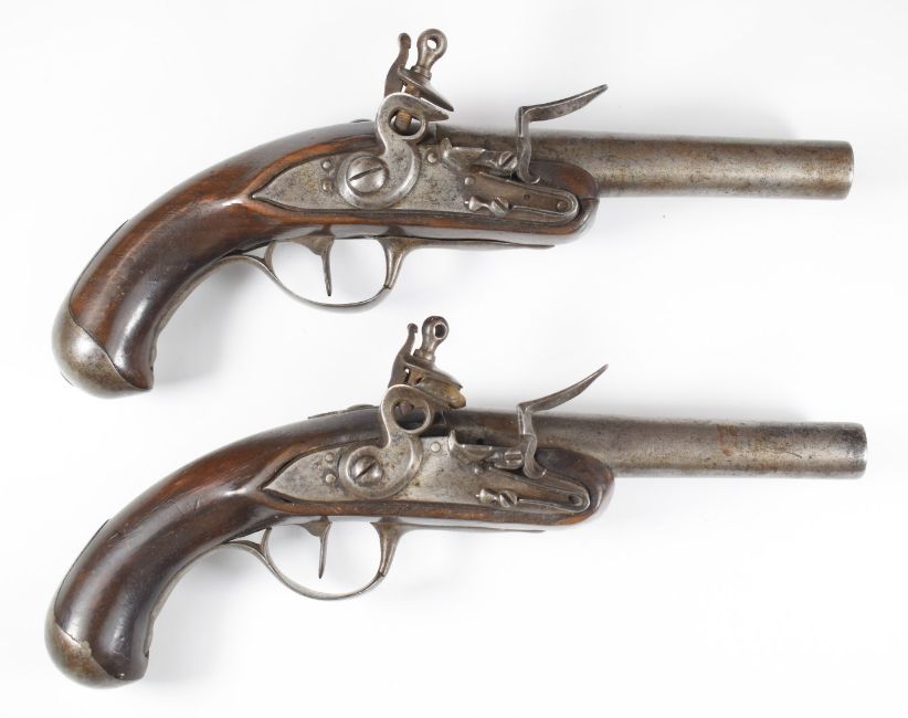 A pair of Queen Anne style flintlock coat pistols, each with steel trigger guard, butt cap and mount and 5 inch smooth bored barrel, overall length 26.5cm.