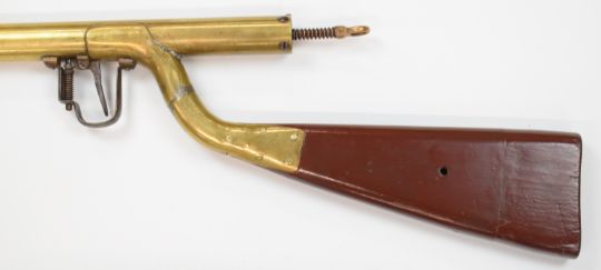 A vintage brass .177 air rifle of unusual construction with externally sprung trigger, straight pull bolt and graduated barrel, overall length 110cm.