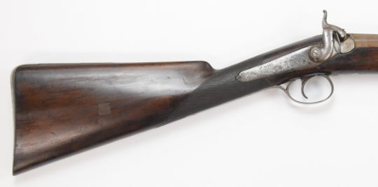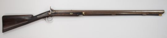 Smith 14 bore percussion hammer action muzzle loading gun with named and engraved locks, engraved trigger guard and top strap, chequered grip, brass tipped wooden ram-rod, fixed sights and 35 inch octagonal barrel, overall length 130cm, NVSN.