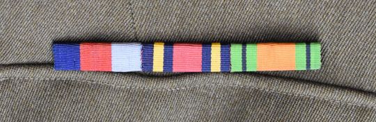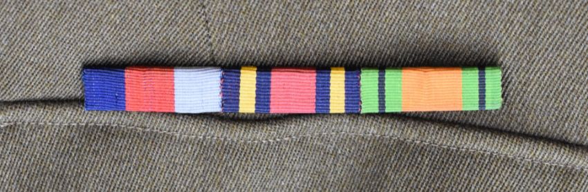 British Army Royal Artillery khaki jacket with associated buttons, Sam Browne belt, Brodie steel helmet dated 1939, Eastern European peaked cap and a tropical issue jacket