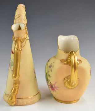 Royal Worcester blush ivory flatback jug and ewer decorated with flowers and a snail, tallest 26cm