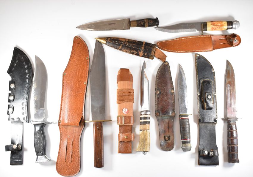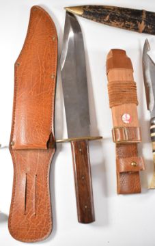 Seven various hunting knives / daggers including one by Esibar with serrated blade and an 'Original Bowie Knife' example, all with sheaths, longest blade 24.5cm. PLEASE NOTE ALL BLADED ITEMS ARE SUBJECT TO OVER 18 CHECK ON COLLECTION OR DELIVERY