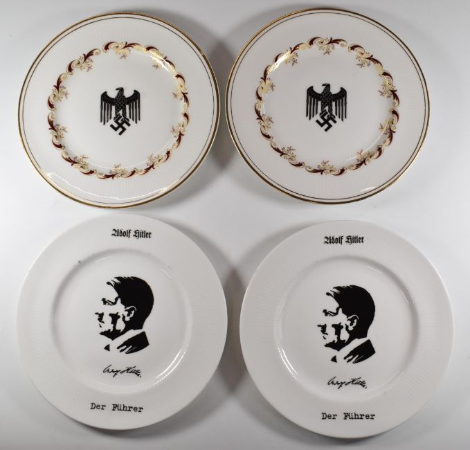 Four WW2 German Third Reich Nazi side plates, two with Hitler's profile, two with eagle and swastika