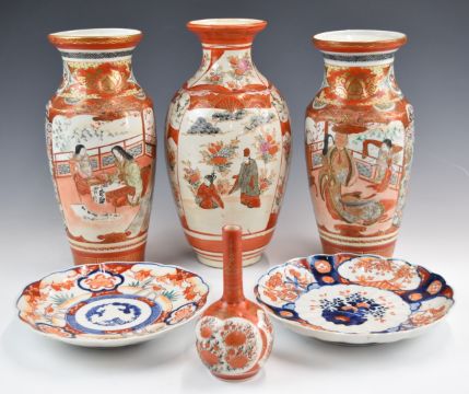 Four Japanese Kutani Imari vases and two plates, tallest 30cm
