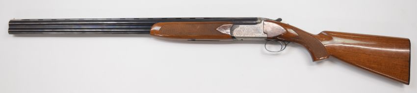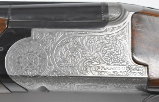 Franchi 12 bore over under ejector shotgun with engraved locks, underside, top plate, thumb lever and fences, chequered semi-pistol grip and forend, vented top rib, single trigger and 28 inch barrels choked ½ and full, overall length 115cm, length of pull 36cm, serial number 4184674. PLEASE NOTE THAT A VALID RELEVANT FIREARMS/SHOTGUN CERTIFICATE IS REQUIRED TO HANDLE/PURCHASE THIS ITEM.