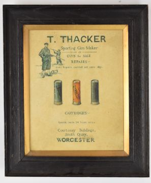 T Thacker of Worcester Sporting Gun Maker advertising watercolour 29 x 23cm, framed and glazed.